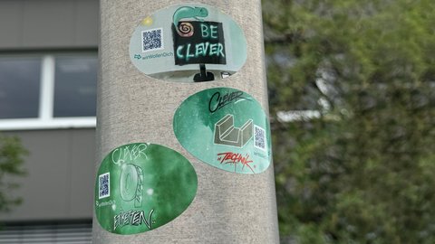 In unserem Azubiworkshop waren wir dem Graffiti auf der Spur. Wir haben uns Clever-Motive erarbeitet, Leinwände besprüht und daraus Sticker entworfen.